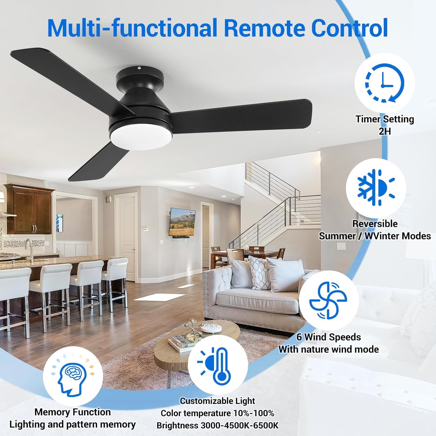 Ceiling Fans with Lights, 42 Inch Low Profile Ceiling Fan with Light and Remote Control, Reversible, LED Dimmable for Bedroom Living Room Indoor/Outdoor Patio Use