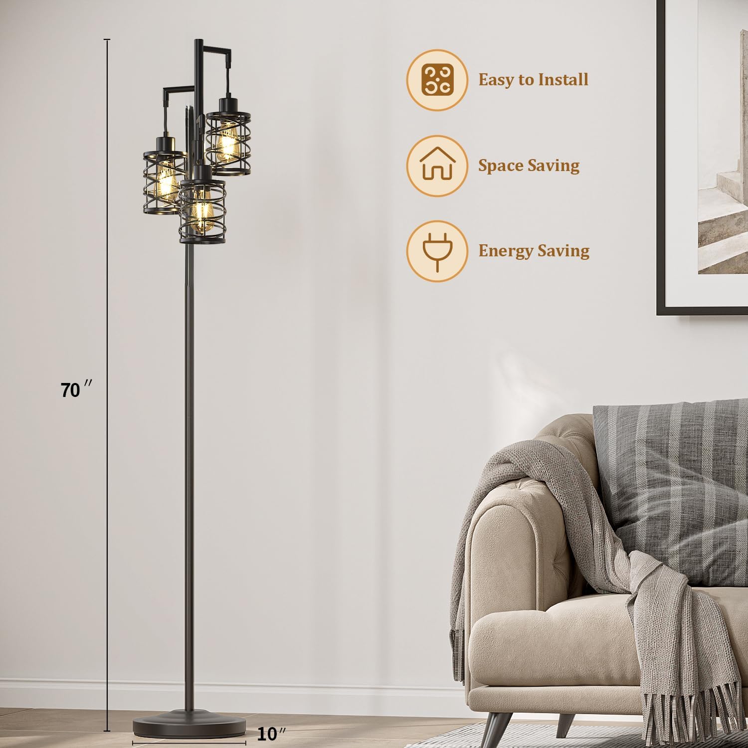 Oneach 70" Industrial Floor Lamp, Stepless Dimmable Standing Lamp with 3 Bulbs, Farmhouse Corner Standing Tree Lamp for Living Room, Tall Lamps for Bedroom, Office, Study Room, Dining Room, Black