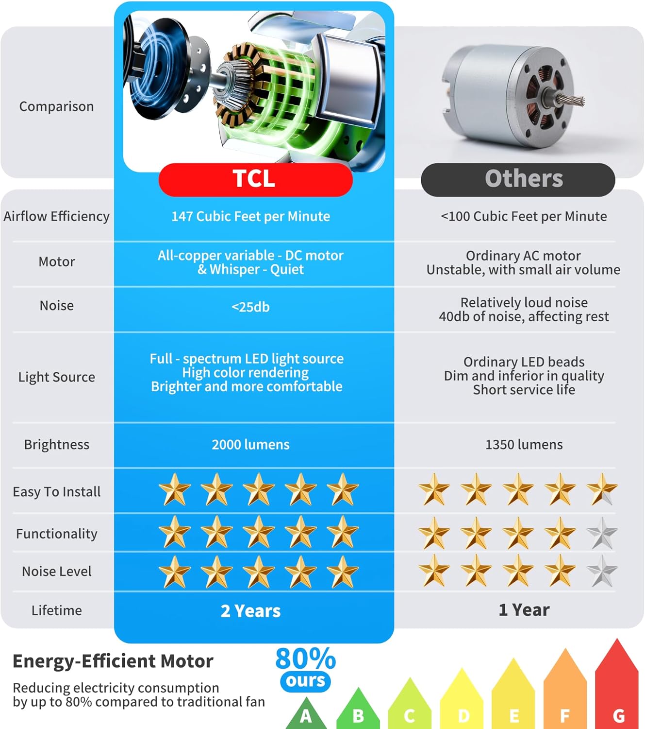 TCL 52" Black Ceiling Fan with Light and Remote, Modern LED 3-Color, 3CCT, Quiet Motor for Bedroom, Living Room, Dining Room, Ceiling Fans with Lights (Black)