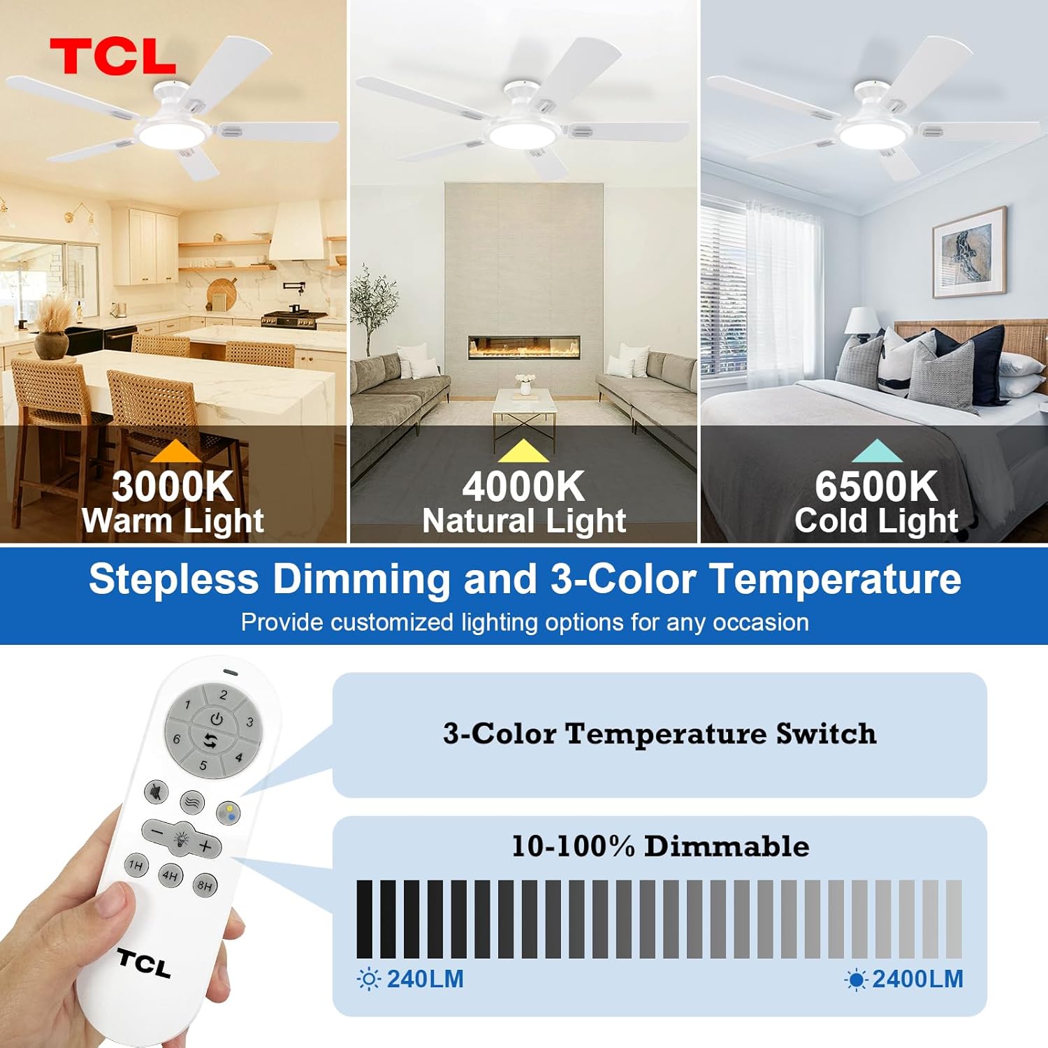 TCL Ceiling Fans with Lights, 52 Inch Low Profile Ceiling Fan with Light and Remote Control, Flush Mount, DC Reversible Motor, Noiseless, 6 Speeds Ceiling Fan for Bedroom (White)