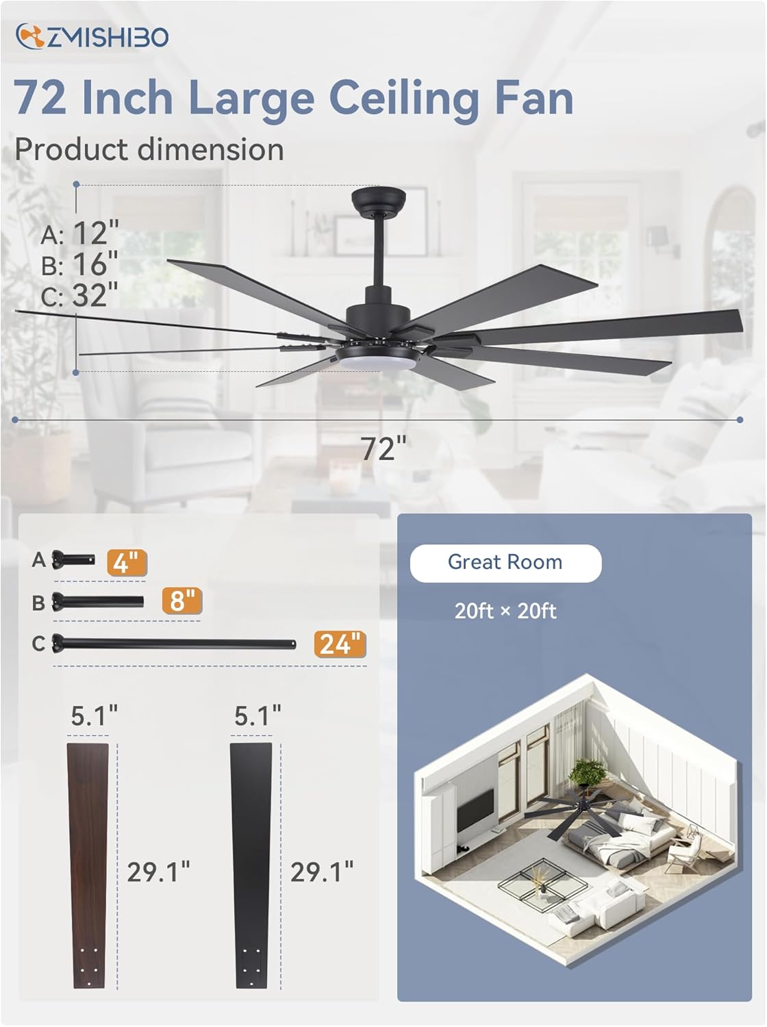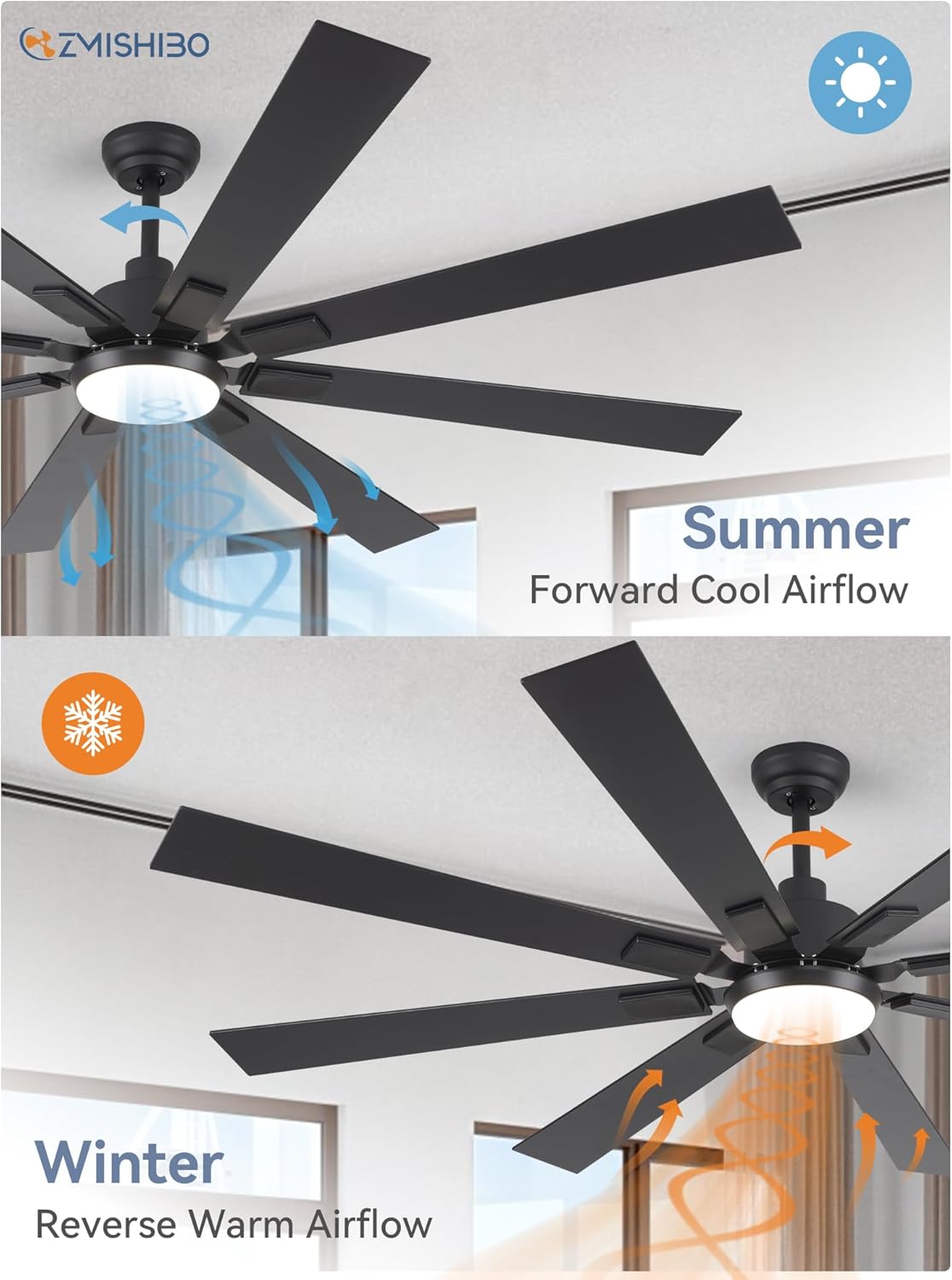 ZMISHIBO 72 inch Large Ceiling Fans with Lights and Remote, Indoor/Outdoor Black Modern Ceiling Fan for Kitchen Living Room Patio, 6 Speed Reversible Quiet DC Motor, 3 CCT, Dual Finish 8 Blades